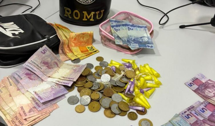 Durante a busca pessoal, os agentes localizaram em uma pochete que o suspeito carregava, onde foi encontrada a quantia de R$ 348,75 em notas diversas, além de 7 porções de crack e 30 porções de cocaína.
