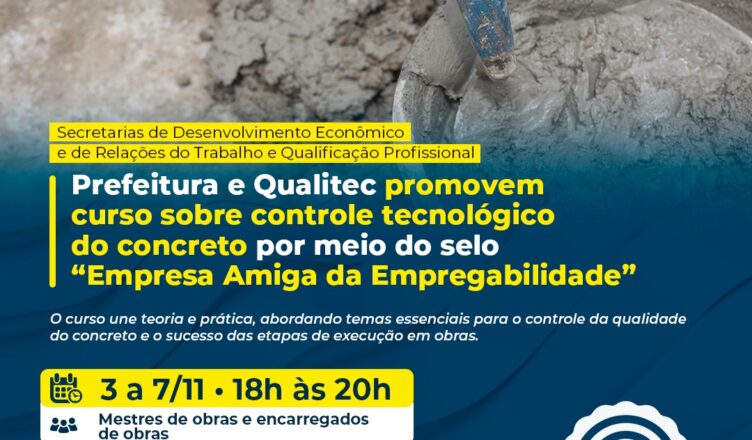 A Prefeitura de Sorocaba, por meio das secretarias de Desenvolvimento Econômico (Sede) e de Relações do Trabalho e Qualificação Profissional (Sert), em parceria com a empresa Qualitec Controle Tecnológico, promove, de 3 a 7 de novembro o curso “A importância do Controle Tecnológico do Concreto – O que saber antes de receber o concreto em obra?”. A capacitação, destinada a mestres de obras e encarregados de obras integra as ações do selo “Empresa Amiga da Empregabilidade”.